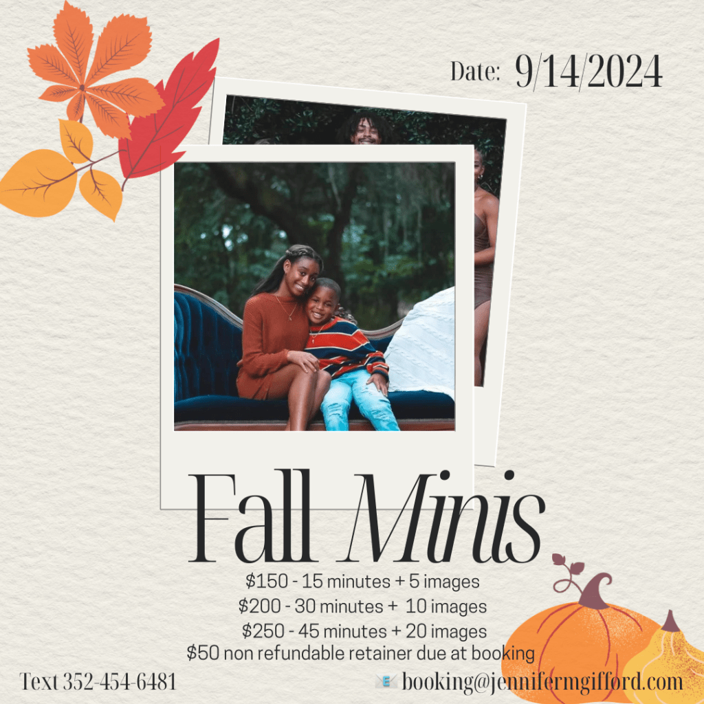 Whether itโs for family photos, a fun coupleโs shoot, or just some solo shots to celebrate the season, our Fall Mini Sessions are a perfect way to capture the essence of autumn. Spots fill up quickly, so donโt wait!